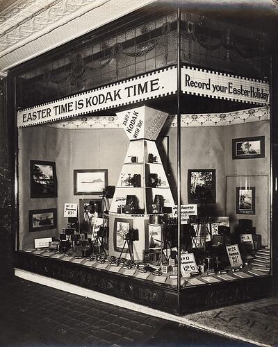 Image of shop front product display, with Kodak (Australasia) Ltd and 'Kodak' embossed in the skirting beneath the window.Lead lighting panels run around top of the window. Photographic products, signage and photographs are abundant in the display case, arranged on draped cloth and plinths with a large conical display stand in the centre of the case and large signs adhered to the upper edge of the window.