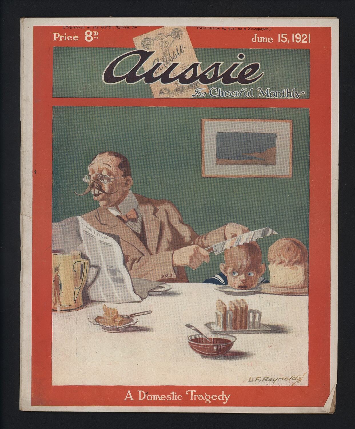 Printed on cover: [Registered at the G.P.O., Sydney, for transmission by post as a Newspaper] / Price 8 D, June 15, 1921 / Aussie, The Cheerful Monthly / L.F. Reynolds / A Domestic Tragedy