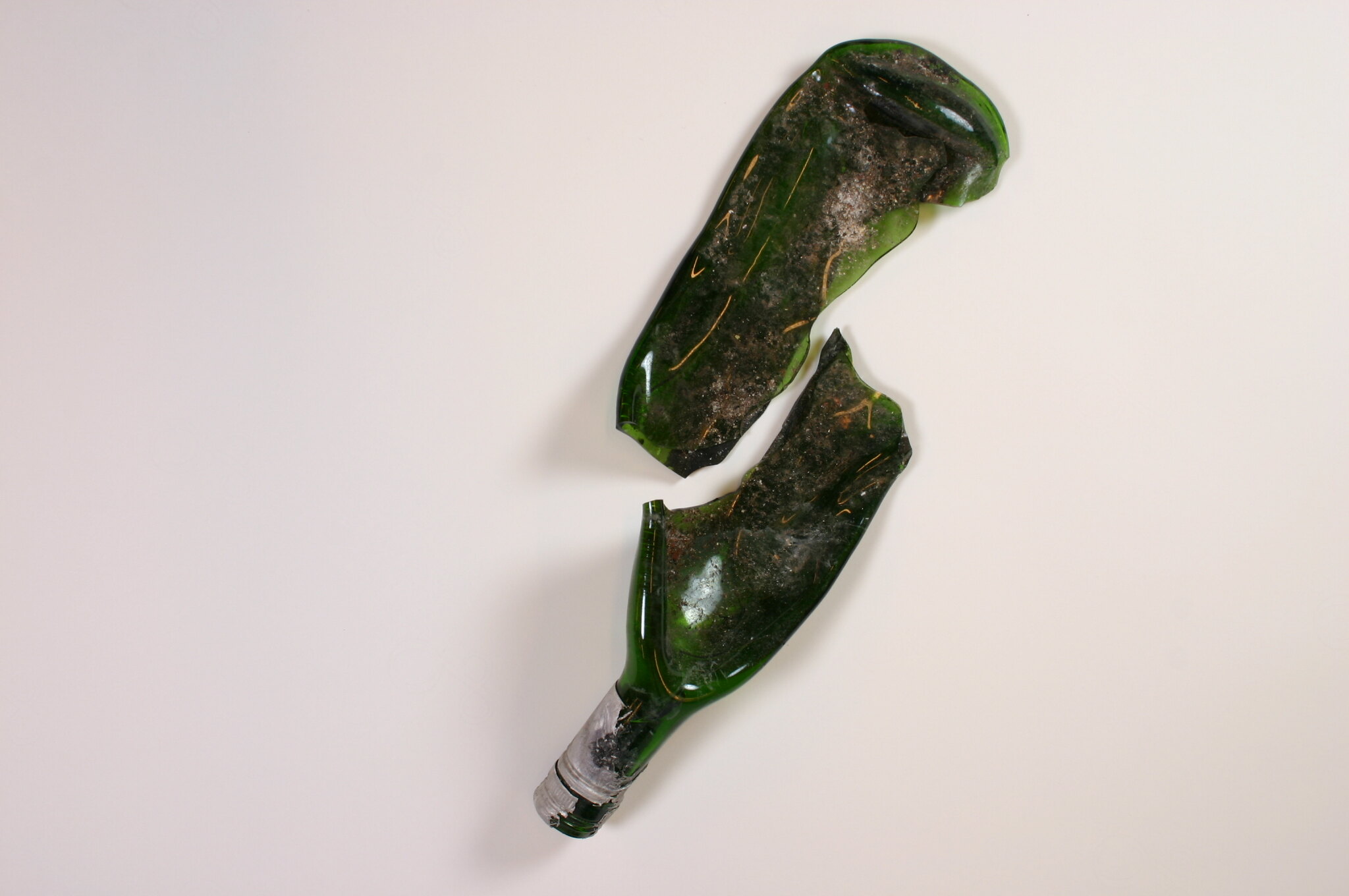 Two pieces of green slumped/melted glass, consisting of the remains of the top and bottom halves of a green glass wine bottle.