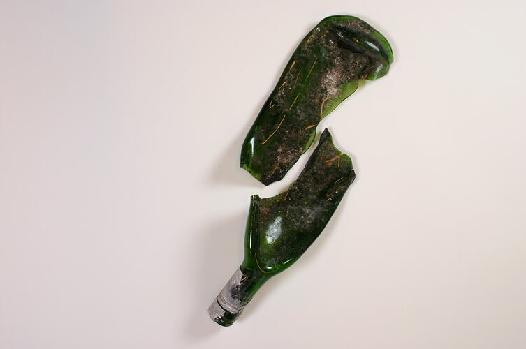 Lump of melted green glass, formed from the destruction by fire of a glass wine bottle. Found in the remains of Lynne Stone's home, destroyed at Marysville by the Murrindindi Bushfire on 7 February, 2009.
