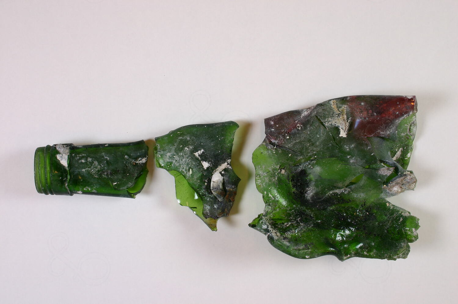 Three pieces of green slumped/melted glass, consisting of the remains of the top and bottom halves of a green glass wine bottle.
