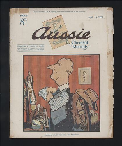 Printed on cover: [Registered at the G.P.O., Sydney, for transmission by post as a Newspaper] / Price 8D / April 15, 1920 / Aussie The Cheerful Monthly / CONDUCTED BY PHILLIP L. HARRIS, FORMER EDITOR OF "AUSSIE," THE DIGGER' OWN JOURNAL, PRINTED AT THE FRONT / DAVID BARKER / MARCHING ORDER FOR THE NEW OFFENSIVE.