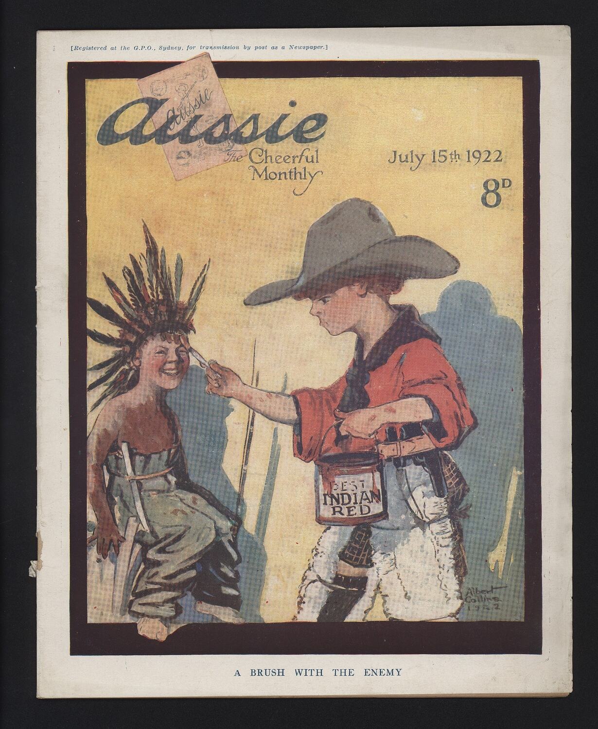 Printed on cover: Registered at the G.P.O., Sydney, for transmission by post as a Newspaper / Aussie The Cheerful Monthly / July 15th 1922 / 8D / BEST INDIAN RED / Albert Collins 1922 / A BRUSH WITH THE ENEMY