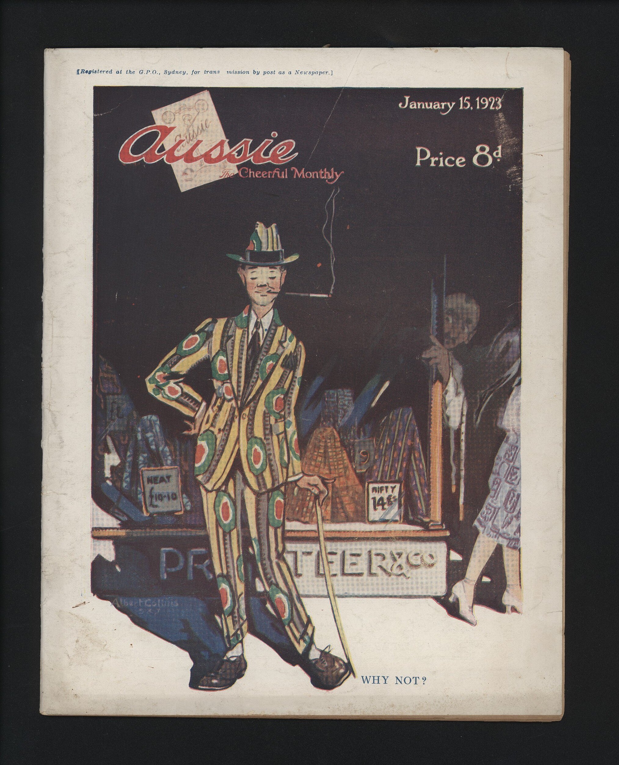 Printed on cover: [Registered at the G.P.O., Sydney, for transmission by post as a Newspaper] / January 15, 1923 / Aussie The Cheerful Monthly / Price 8d. / Albert Collins / WHY NOT?