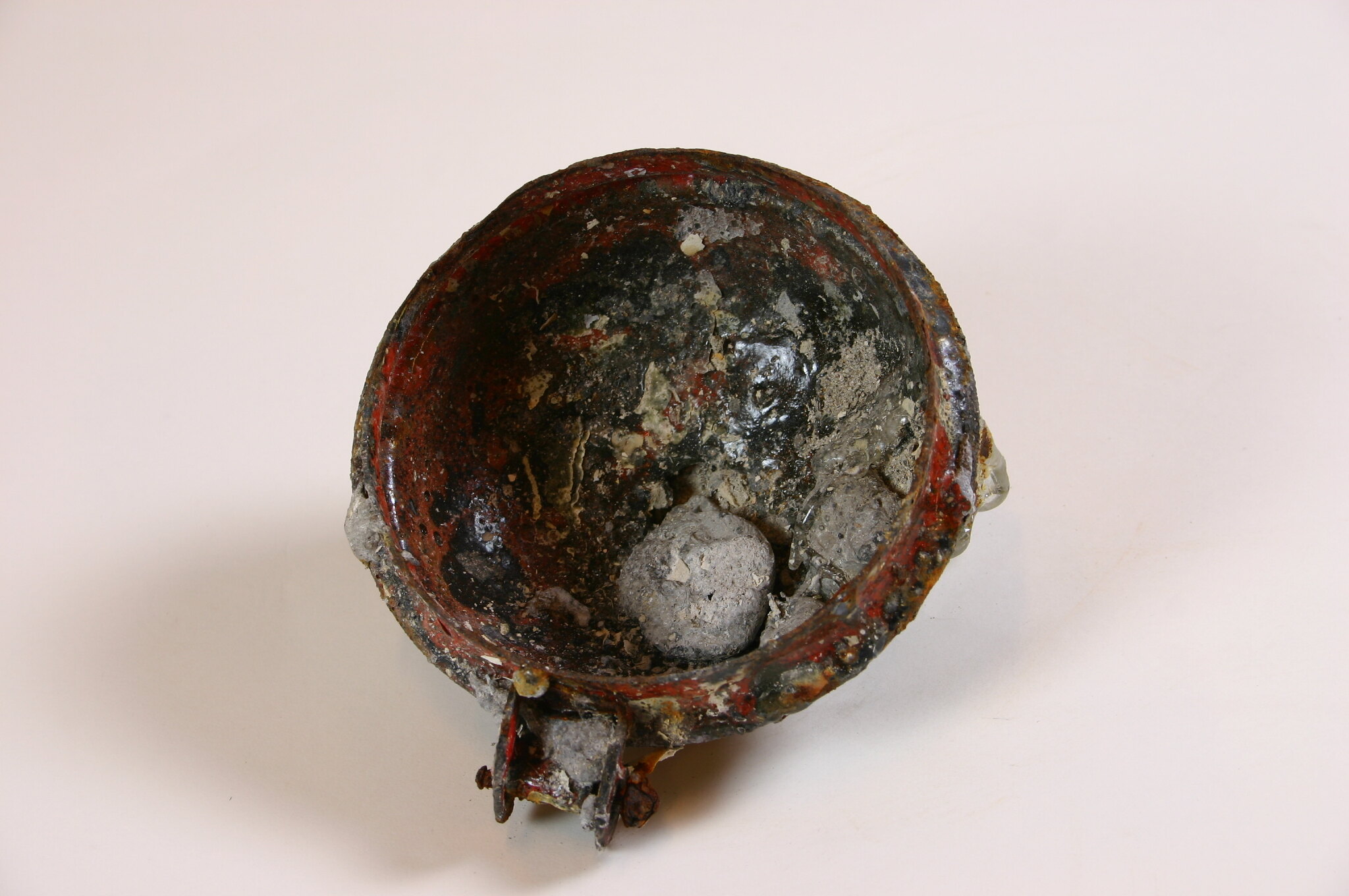 Fire-damaged domed metal pot lid, covered with remnants of the original red enamelled paint, which has ash and other debris embedded into it. There is a hinge on one side and knob on top, which has a large lump of melted clear glass fused to it. Inside there are several lumps of melted metal and glass fused to the surface.