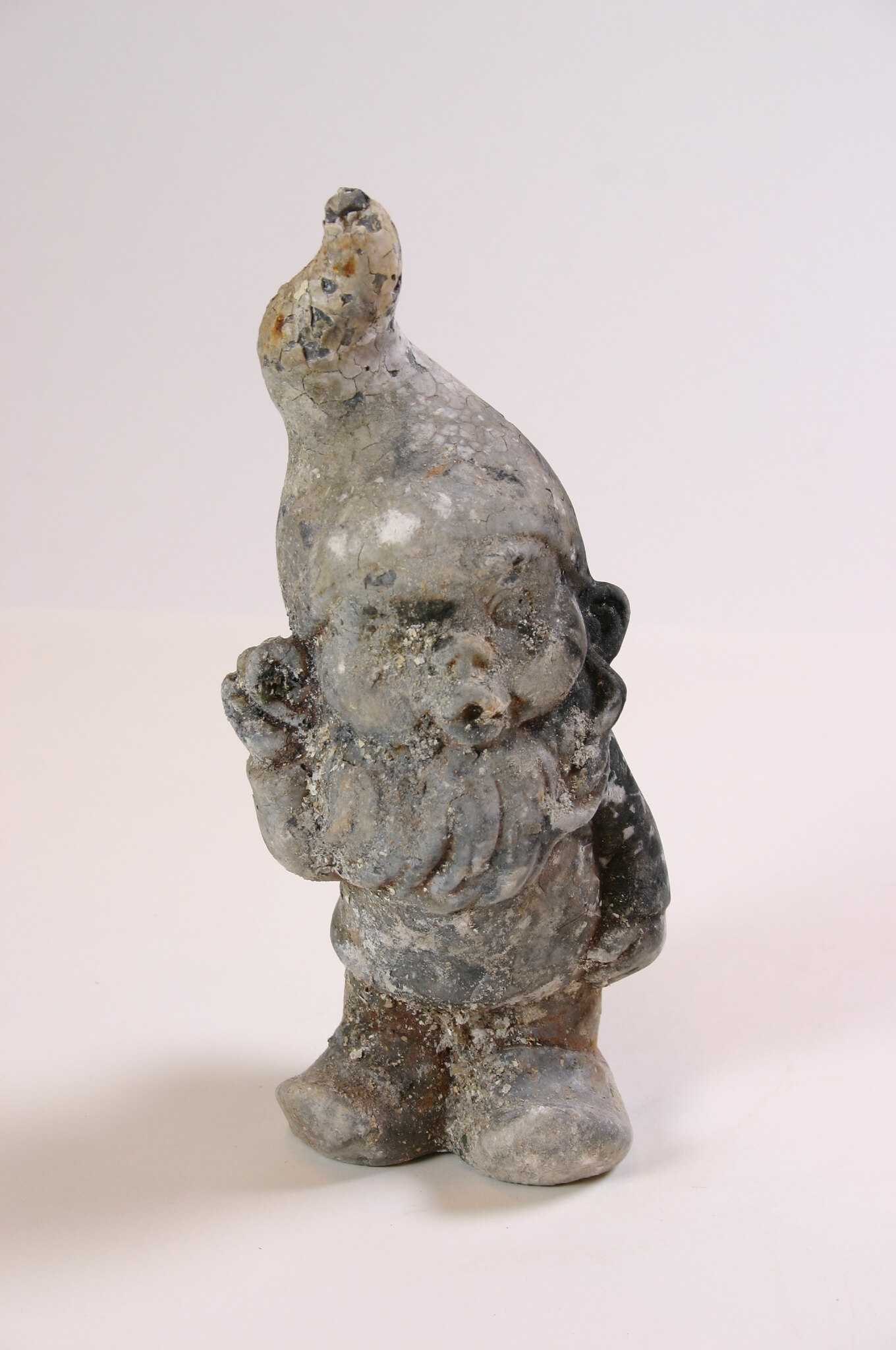 Fire-damaged cast-cement male gnome statue. He has a beard, and his right hand is raised to his ear, as if trying to hear something. On his head is a pointed hat and on his feet are clog-style shoes. Original surface finish is gone but the crackling effect suggests paint. Ash and other debris is attached to the surface.