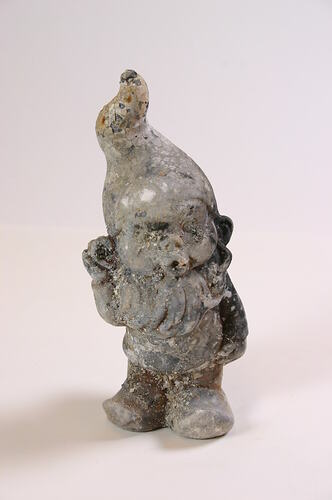 Burnt cast-concrete ornament male gnome. Found in the remains of Lynne Stone's home, destroyed at Marysville by the Murrindindi Bushfire on 7 February, 2009.