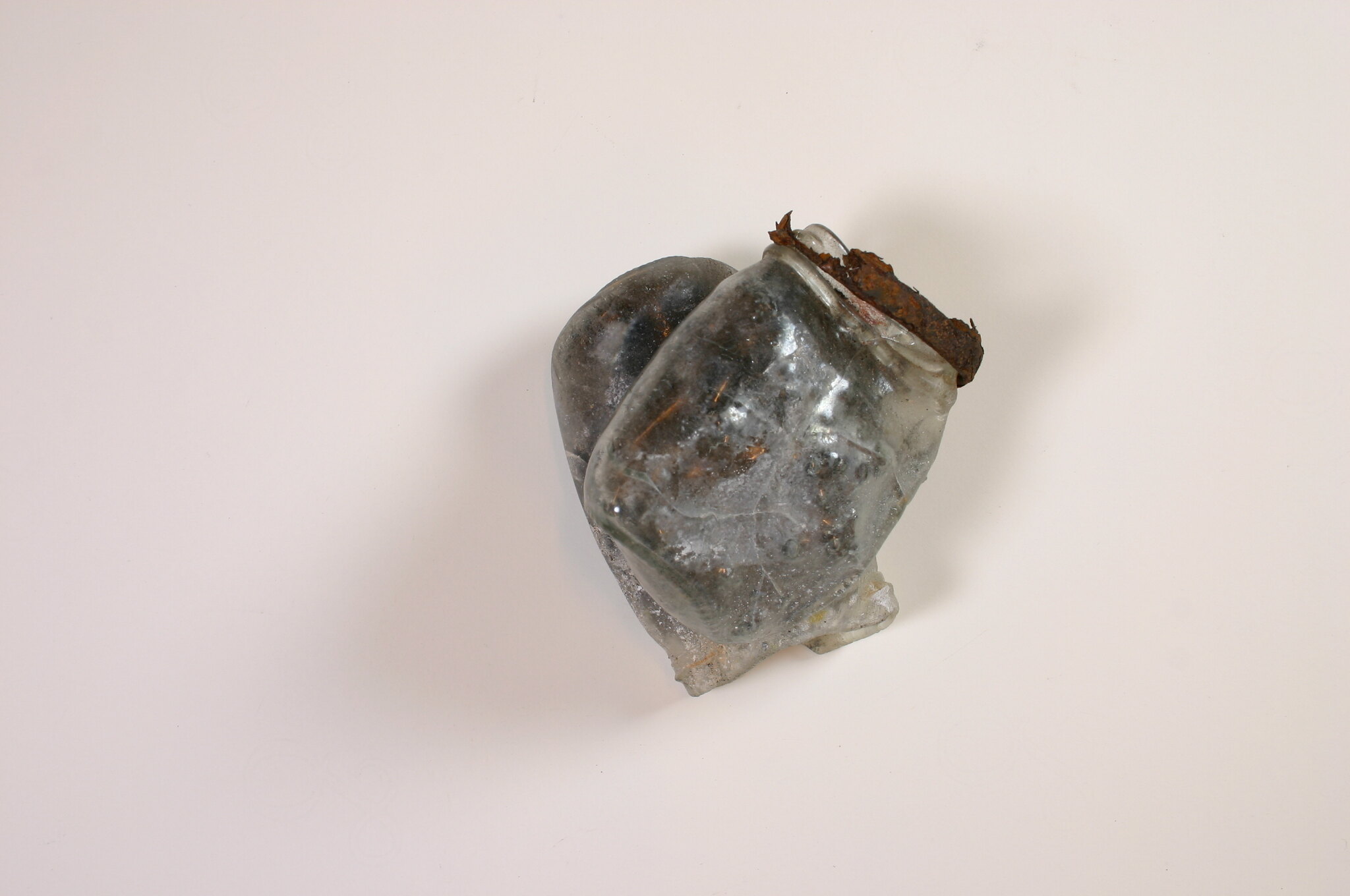 Lump of clear slumped/melted glass, consisting of the remains two glass jars fused together, one on top of the other. The top one has the remains of a screw top metal lid. Ash and other debris is embedded in the glass, whilst a pile of debris remains inside each jar.