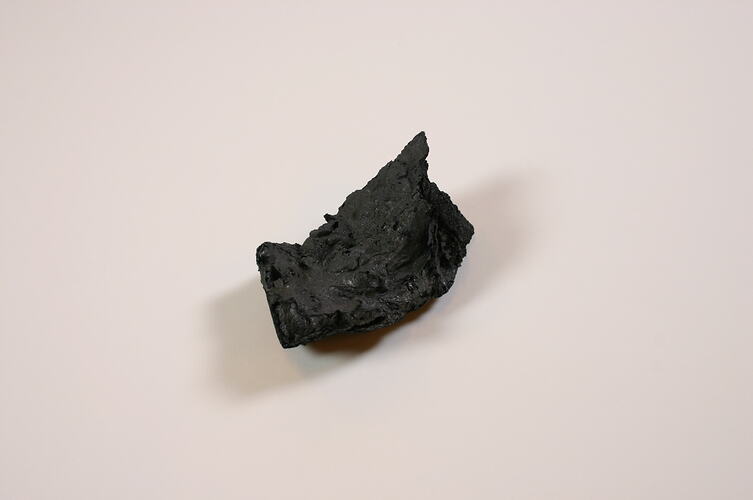 Small piece of charcoal, formed through the destruction by fire of a container of an unknown foodstuff. It was located in the pantry cupboard and found in the remains of Lynne Stone's home, destroyed at Marysville by the Murrindindi Bushfire on 7 February, 2009.