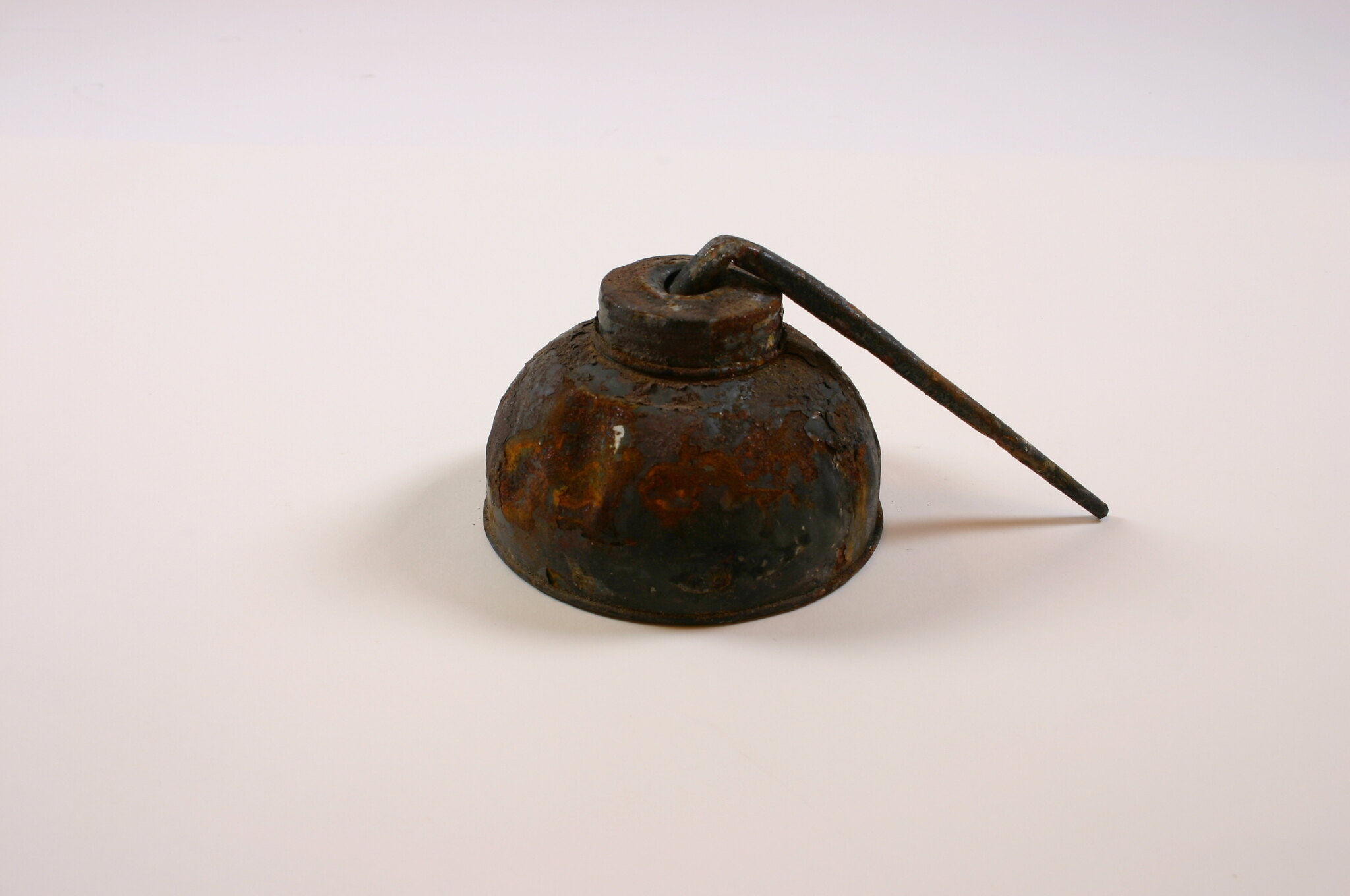 The oil can dates from 1940s-1950s and was used by Bill but originally belonged to Peter Strickland, the donor's father-in-law.