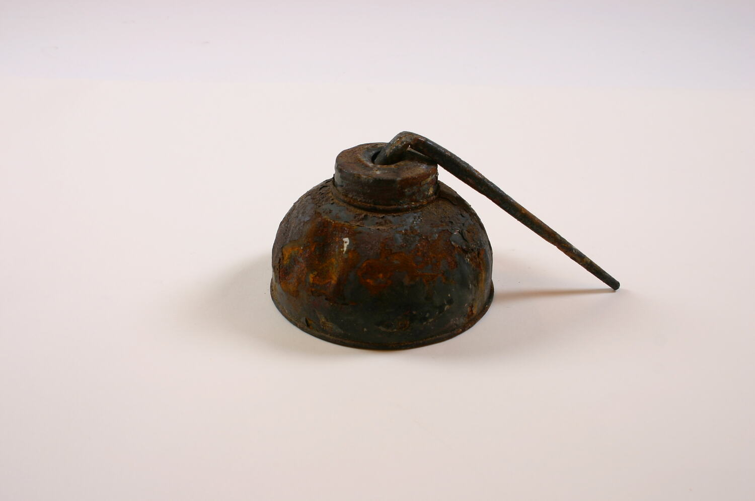 Dome-shaped oil can with a circular base and screw on central cap and nozzle. The nozzle is loose and bent to one side.