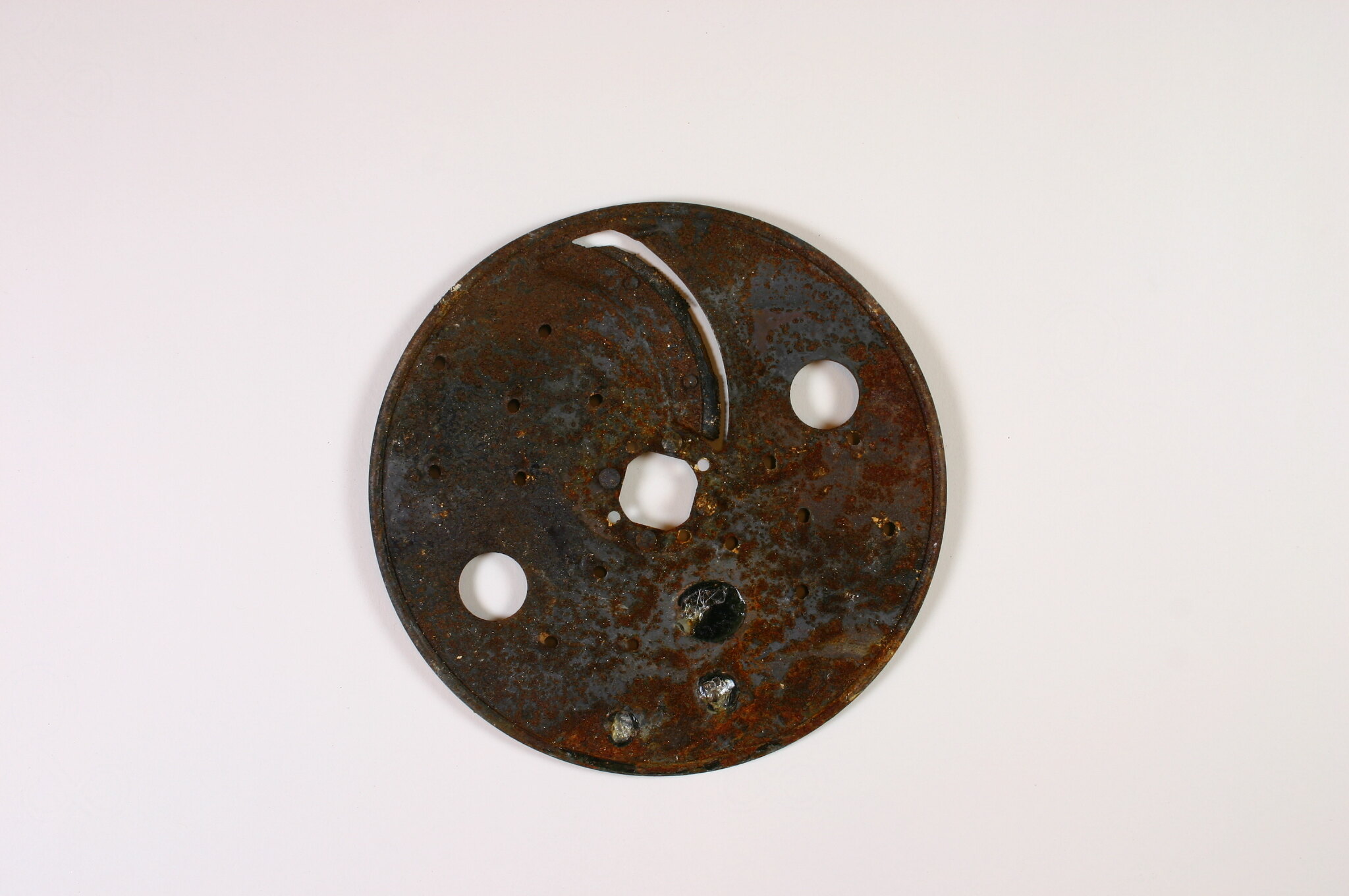 Disc with central squared hole, 4 rivets, 2 circular holes, serrated cutting blade and raised grating holes. There are three small deposits of unknown melted substances.