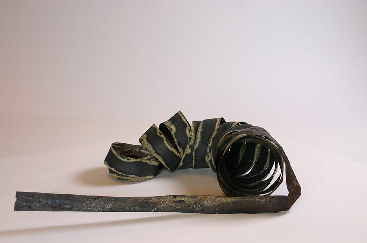 Found in the wreckage of Bill Coppinger's shed, this is the remnants of a standard 8-metre Stanley builder's tape measure. It has been transformed by fire into a fragile ribbon of burned steel.