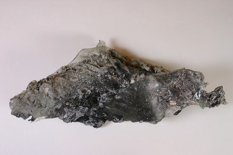 Melted glass with embedded debris. The glass originally formed a floor-to-ceiling window in the house; the glass has slumped and compacted into an irregular shape. At some points, the glass pane shape remains, while other areas have formed an unidentifiable mass.