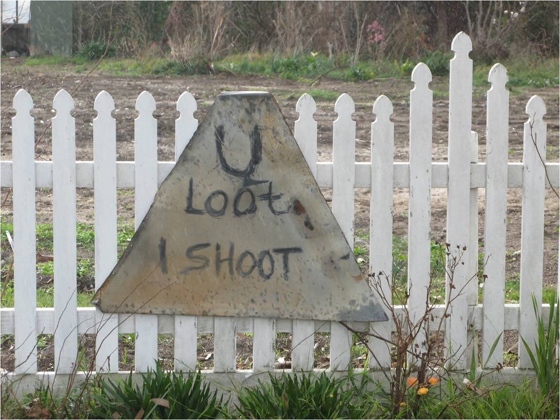 Home made sign with the slogan 'U Loot I Shoot'. It was collected from the burnt-out home of Harry & Norma Coomber, Tarra Valley Road, Devon North, which had been destroyed by the Devon North bushfire on Black Saturday 7 February 2009.