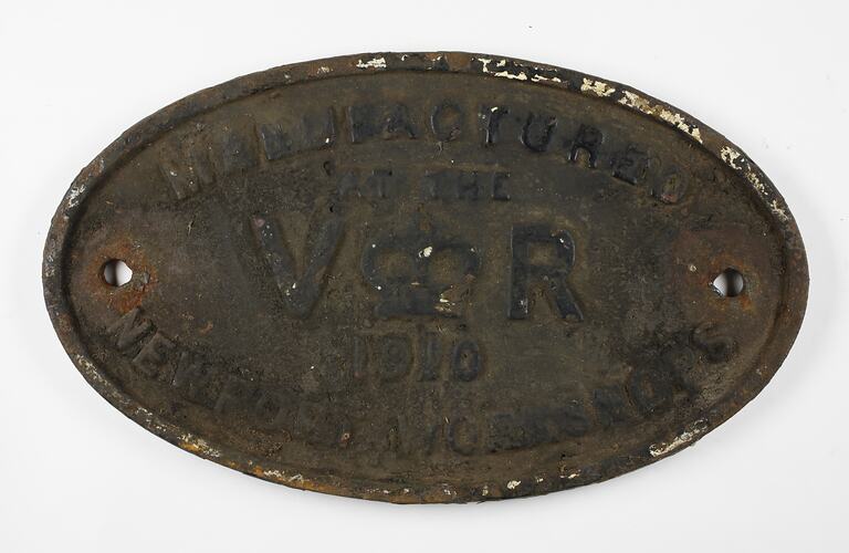 A locomotive builder's plate for Victorian Railways Newport Workshops, Victoria, Australia, 1910.
