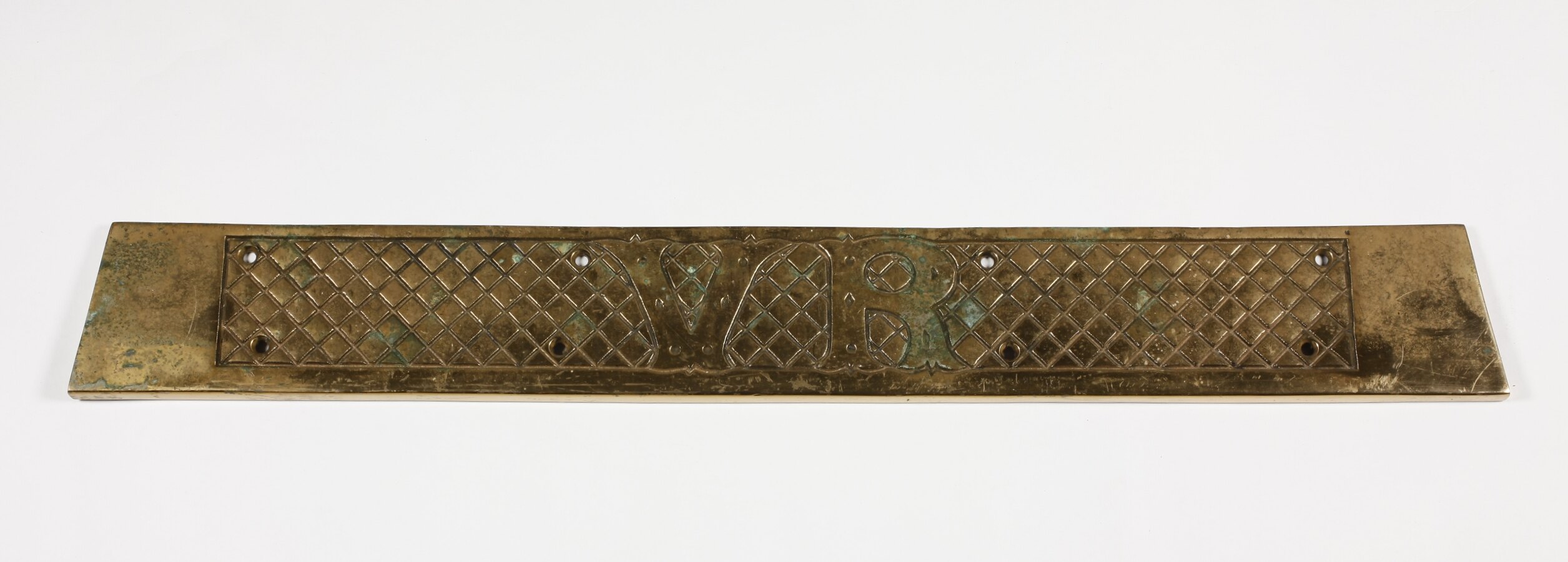Parallelogram shaped , right angle sheet of brass. Diamond pattern and letters pressed into surface. Eight holes.