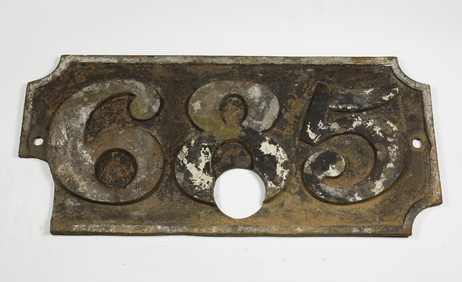 Rectangular brass plate with cut-out edges. Rusted. Text in relief. Remnants of black, white and grey paint. Two small holes and one large round hole. Unrestored.