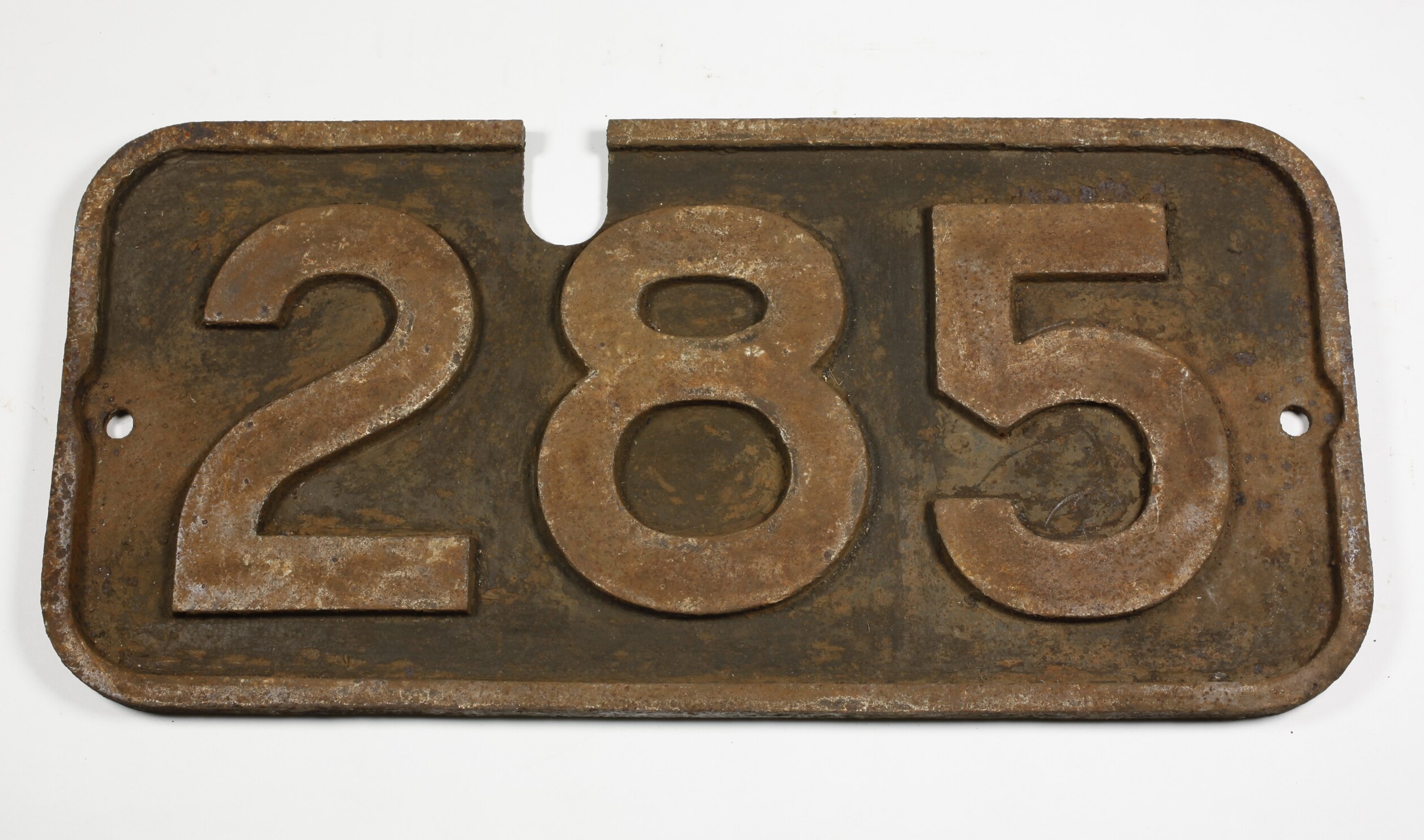Rectangular cast iron plate with rounded edges. Rusted. Text in relief. Two round holes; one slot. Unrestored.