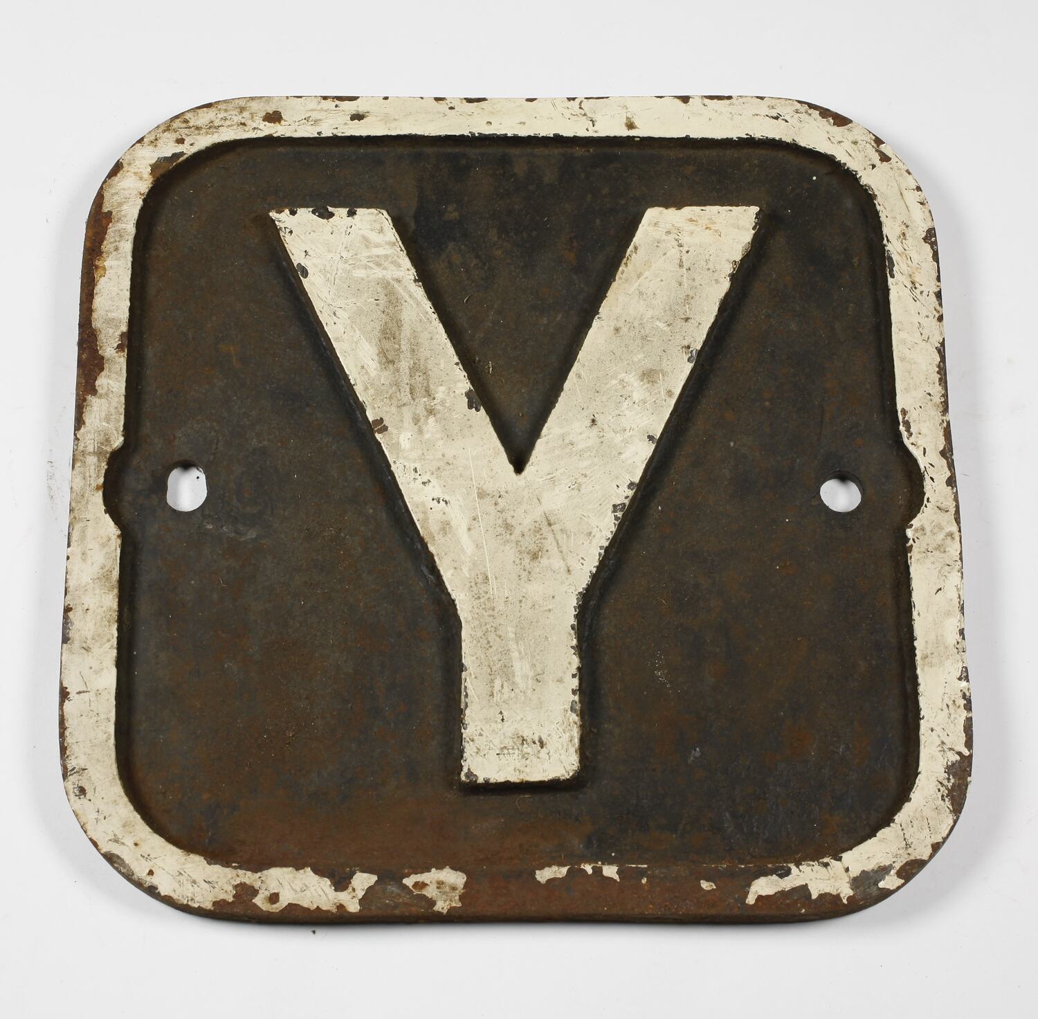 Square metal plate with rounded corners. Rusted. Text in relief, peeling white paint. Two round holes. Unrestored.