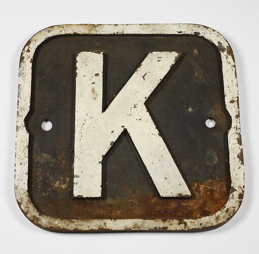 Square metal plate with rounded corners. Rusted. Text in relief, peeling white paint. Two round holes. Unrestored.