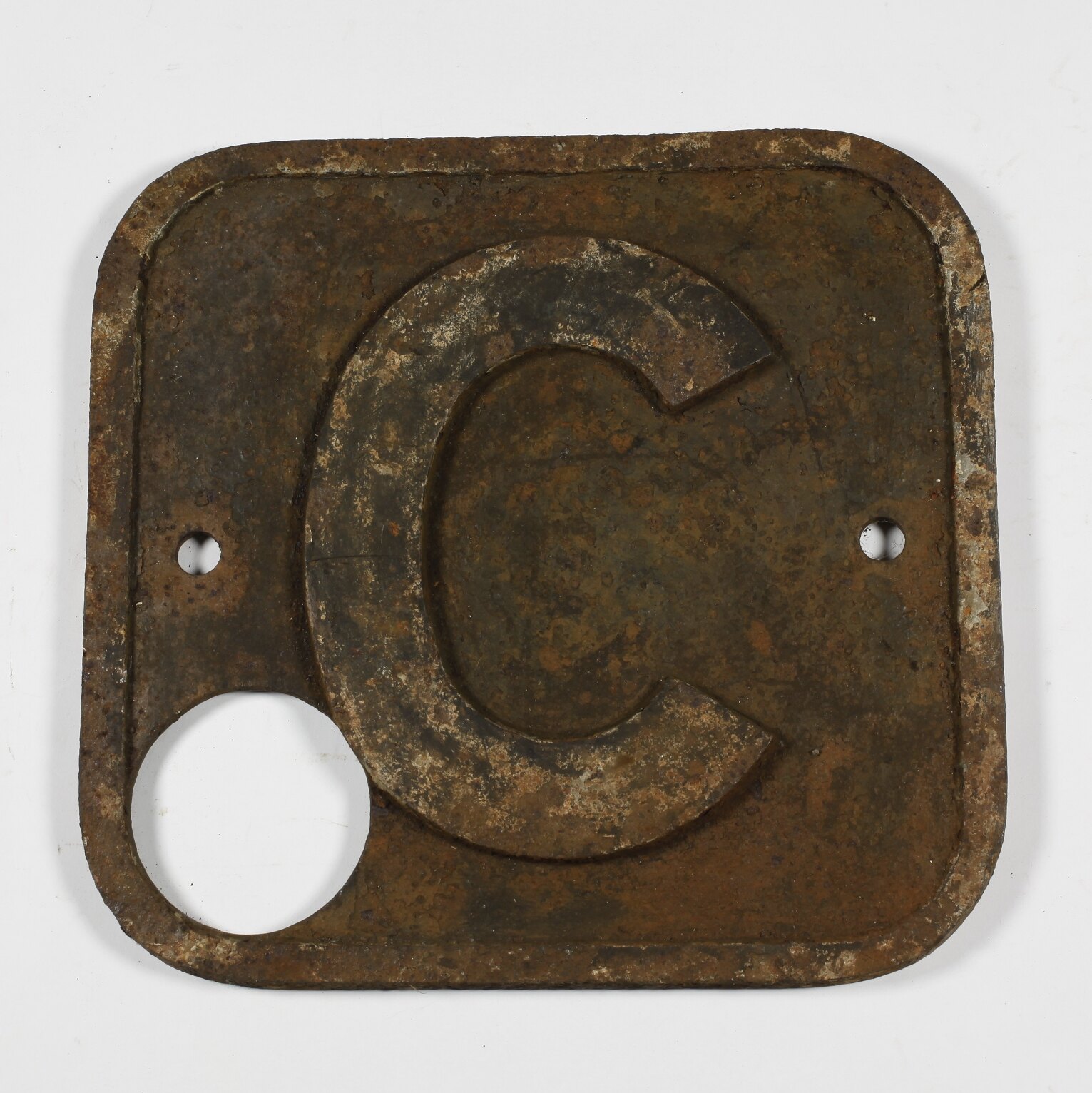 Square metal plate with rounded corners. Text in relief. Rusted. Two small round holes; one large hole.