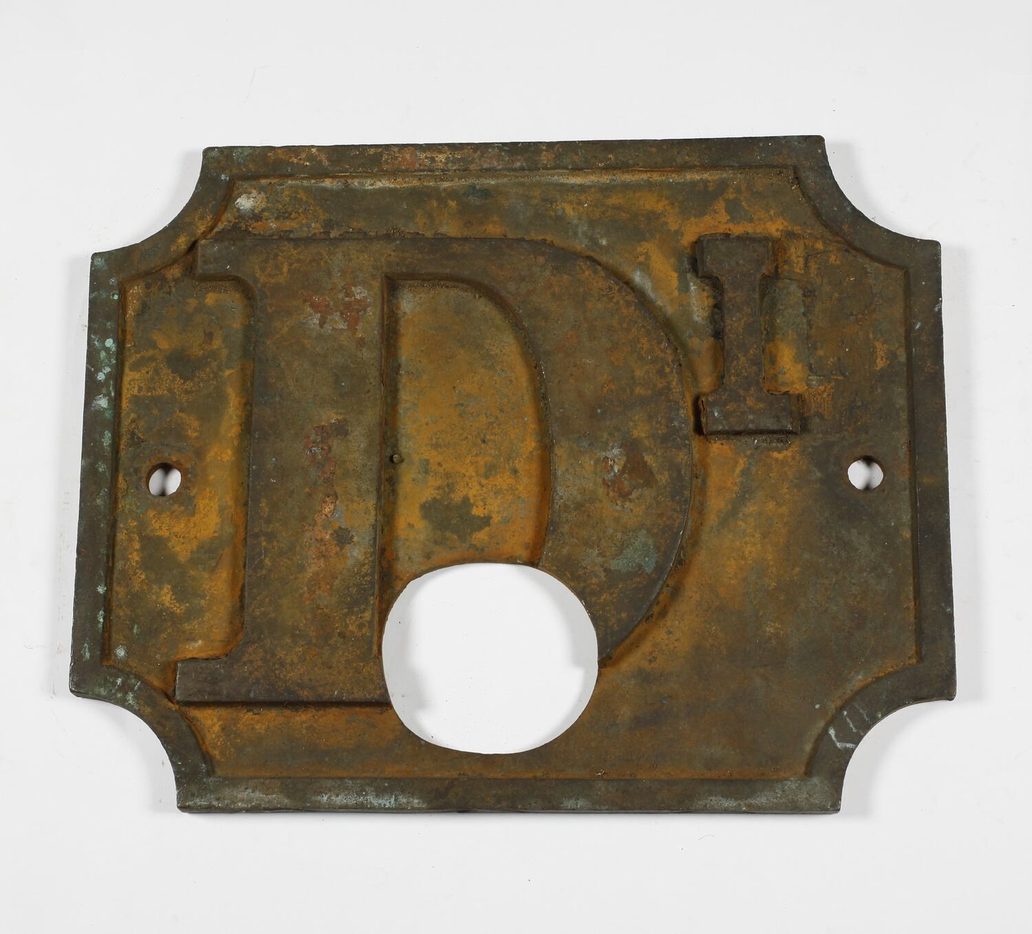Square brass plate with cut-out corners. Surface corrosion. Text in relief. Two small round holes; one large hole. Unrestored.