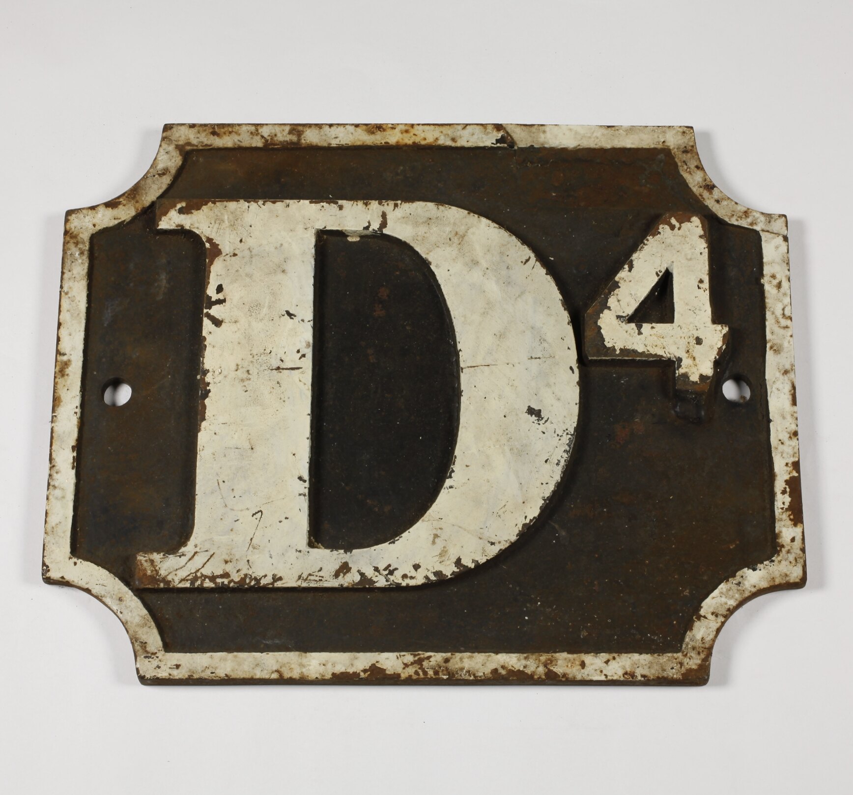 Rectangular metal plate with cut-out corners. Rusted. Text in relief, painted white Two round holes. Unrestored.