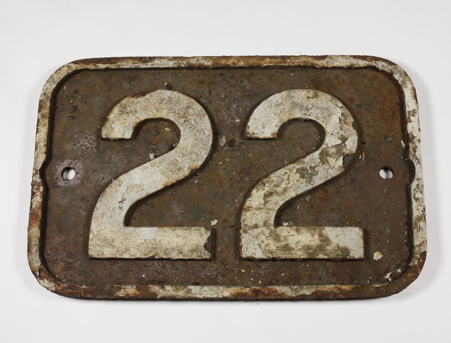 Rectangular metal plate with rounded corners. Rusted. Text in relief. Peeling white paint. Two round holes. Unrestored.