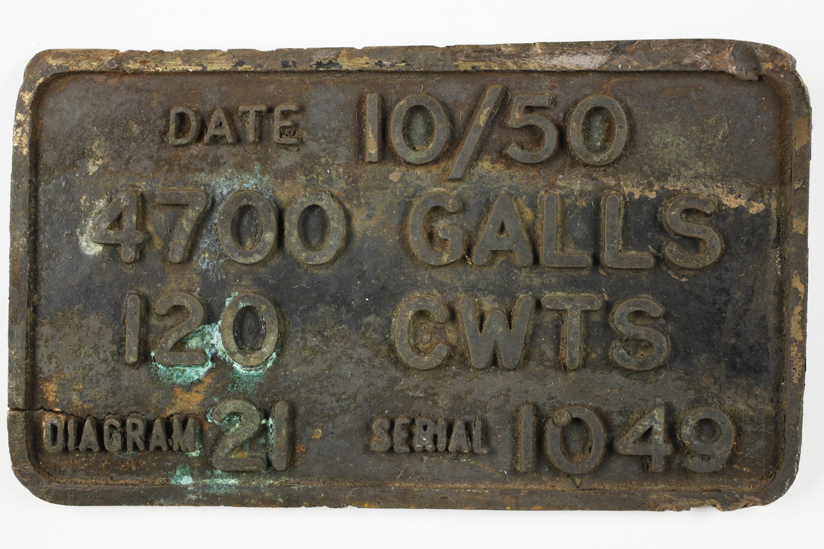 Front: " DATE 10/50 / 4700 GALLS / 120 CWTS / DIAGRAM 21 SERIAL 1049 "