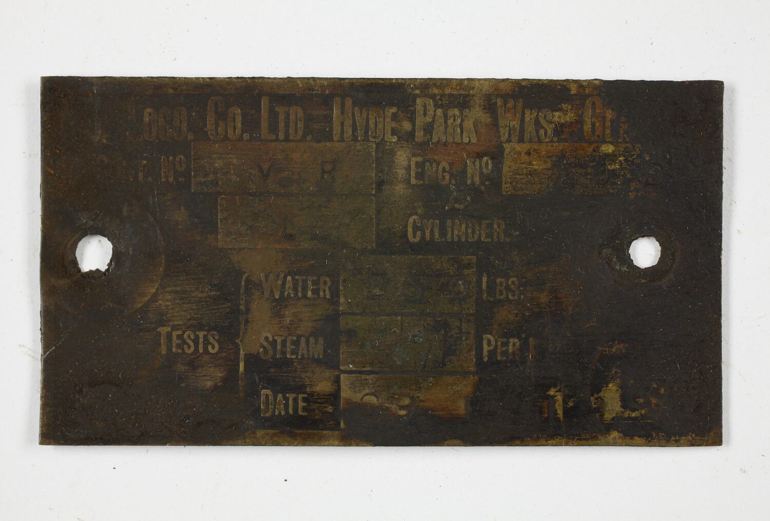 Front of plate: " N.B. LOCO. CO. LTD. HYDE PARK WKS. GLASGOW / CONT. No VR ENG No. 702 / L CYLINDER. / WATER 260 LBS / TESTS STEAM [not stated] PER [image of square] " / DATE 29 . 1. 51 "