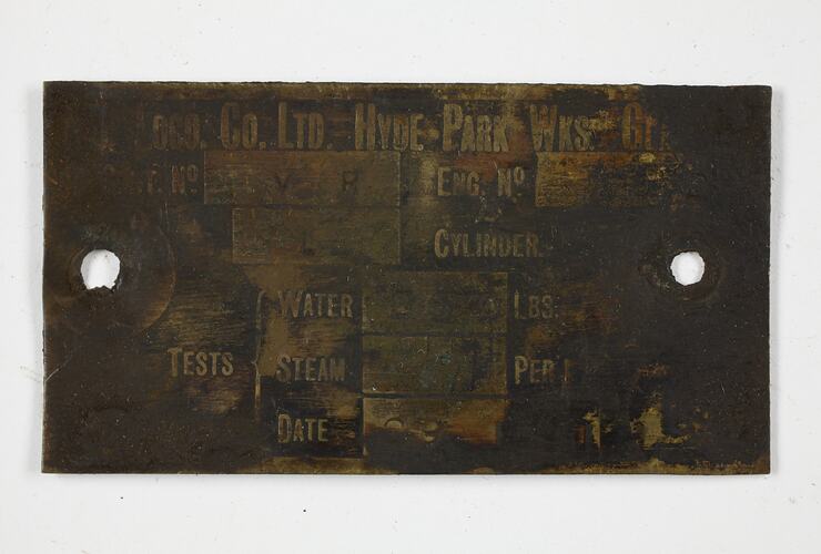 Test plate for the left cylinder of locomotive engine no. 702 manufactured for Victorian Railways by the North British Locomotive Company Limited, Hyde Park, Glasgow, Scotland, dated 29th January 1951.