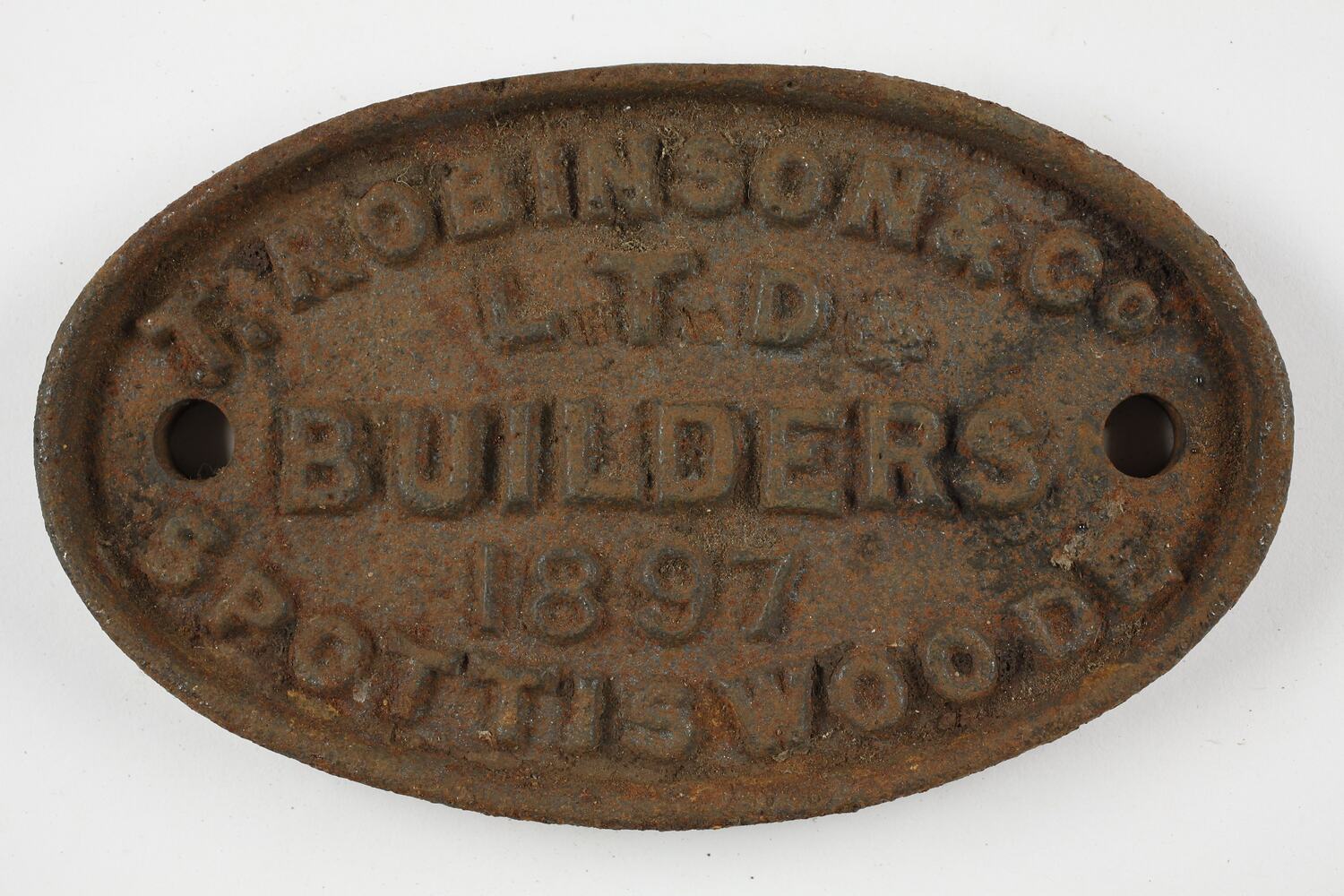 A rollingstock builder's plate, very likely for a goods wagon, made by T. Robinson & Company Limited, Spottiswoode, Victoria, Australia, 1897.