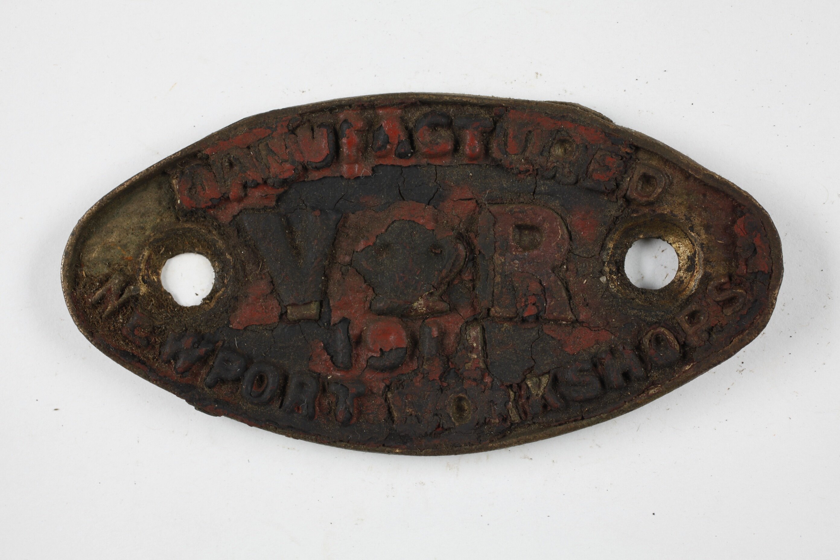 Oval brass plate. Remains of red paint on surface. Two holes for mounting. Text in relief. Unrestored.