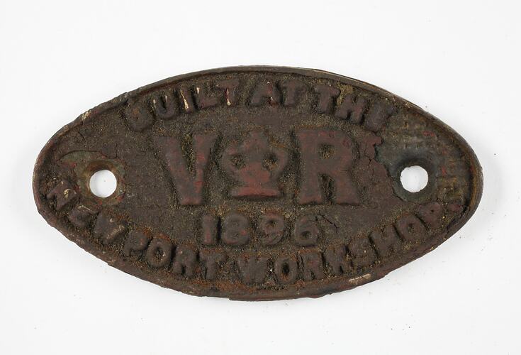 A rollingstock builder's plate, very likely for a Goods wagon, made by the Victorian Railways Newport Workshops, Victoria, Australia, 1896.