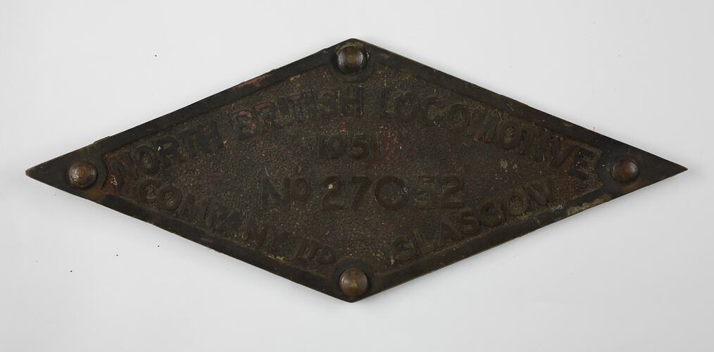 Builder's Number Plate for locomotive No. 27052, North British Locomotive Company Limited of Glasgow, Scotland.