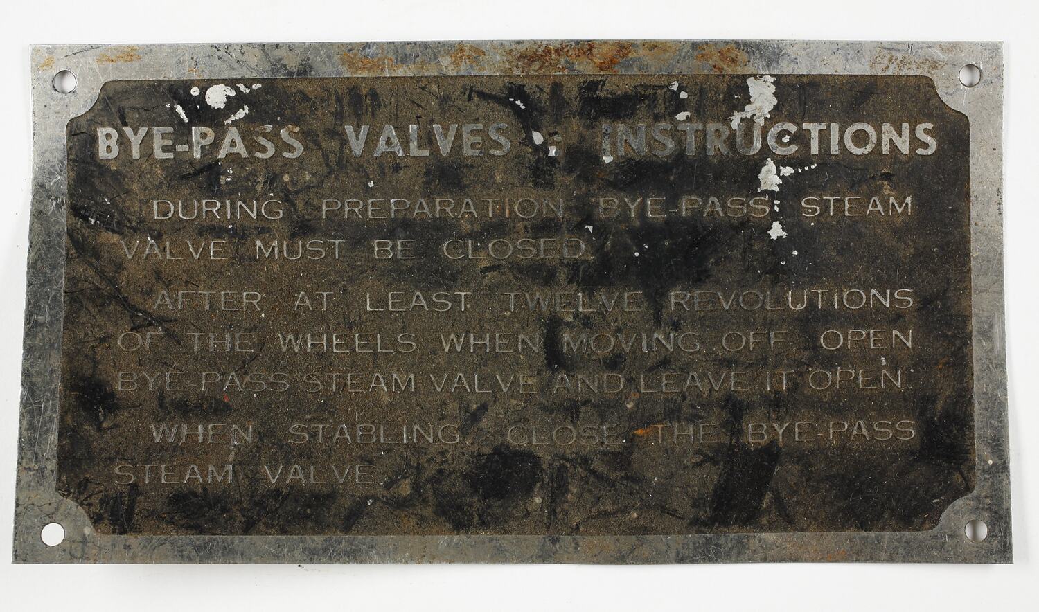 An instruction plate for the use of bye-pass (or bypass) valves on a locomotive.
