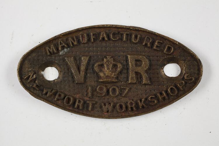 A rollingstock builder's plate, very likely for a Goods wagon, made by the Victorian Railways Newport Workshops, Victoria, Australia, 1907.