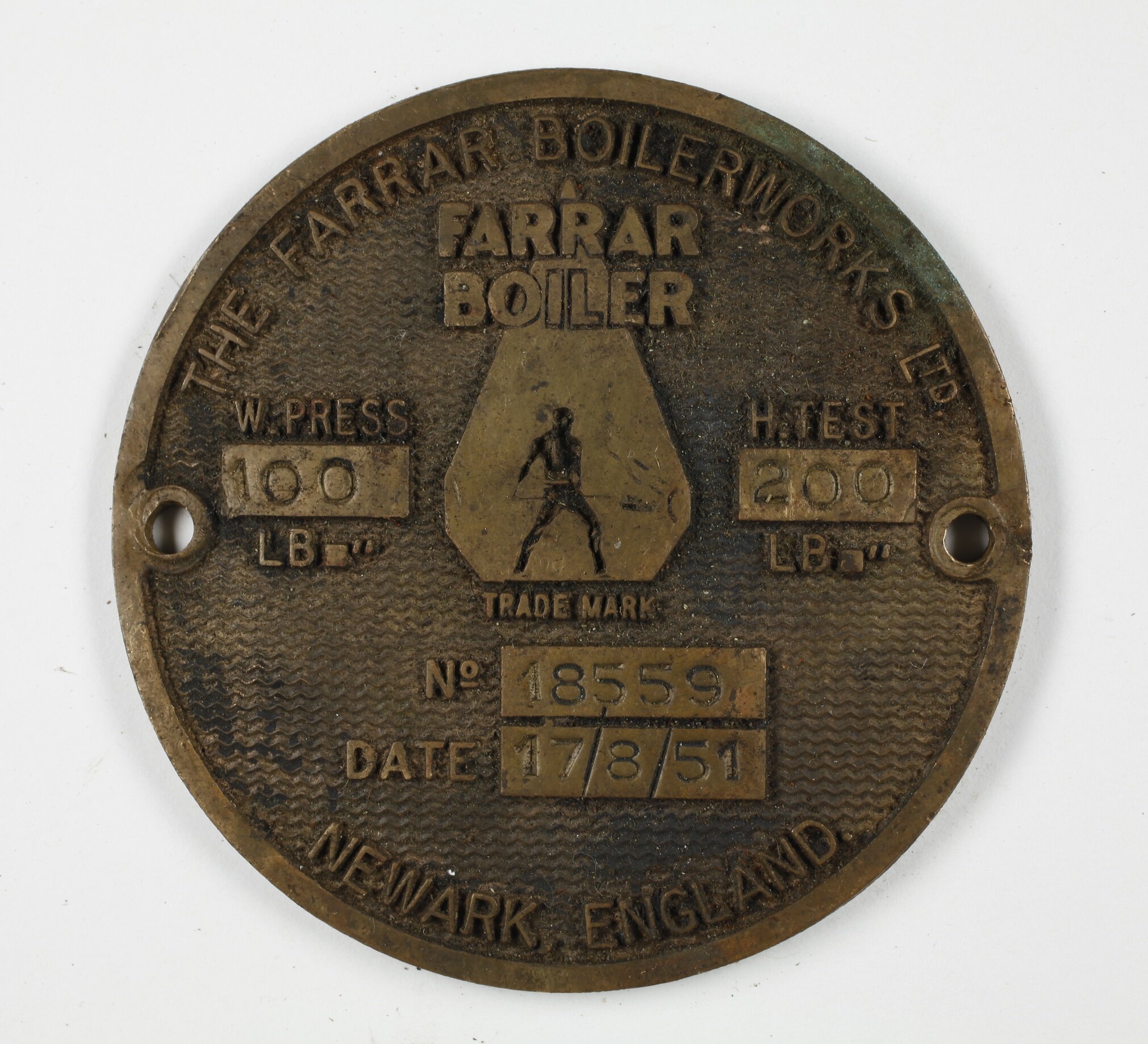 Front of plate: " THE FARRAR BOILERWORKS LTD. / FARRAR / BOILER / [image of man] / TRADEMARK. / No. 18559 / DATE 17 8 . 51 / NEWARK, ENGLAND. ", " W.PRESS / 100 / LB." ", " H.TEST / 200 / LB." "