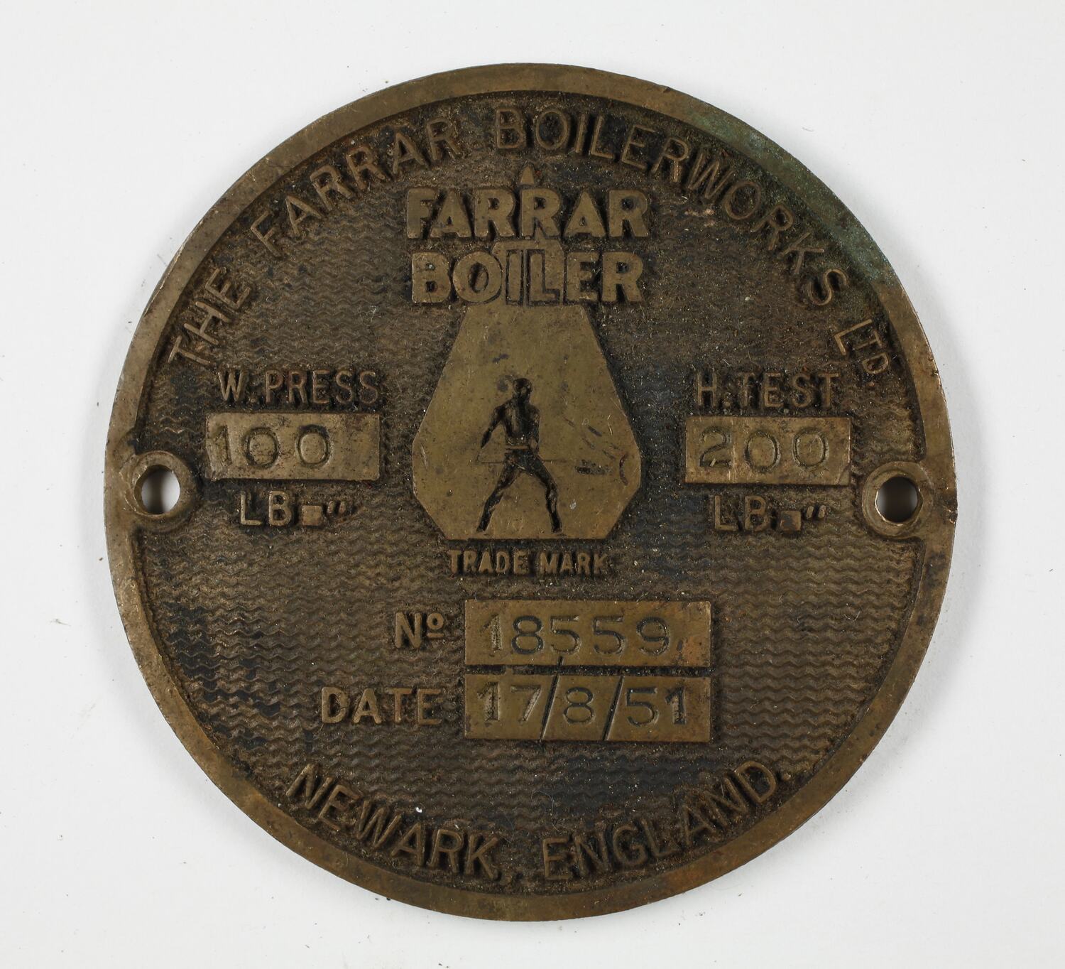 A manufacturer's plate for a locomotive boiler, No. 18559, made by The Farrar Boilerworks Ltd, Newark, England in 1951. The boiler had a working pressure of 100 pounds per square inch.