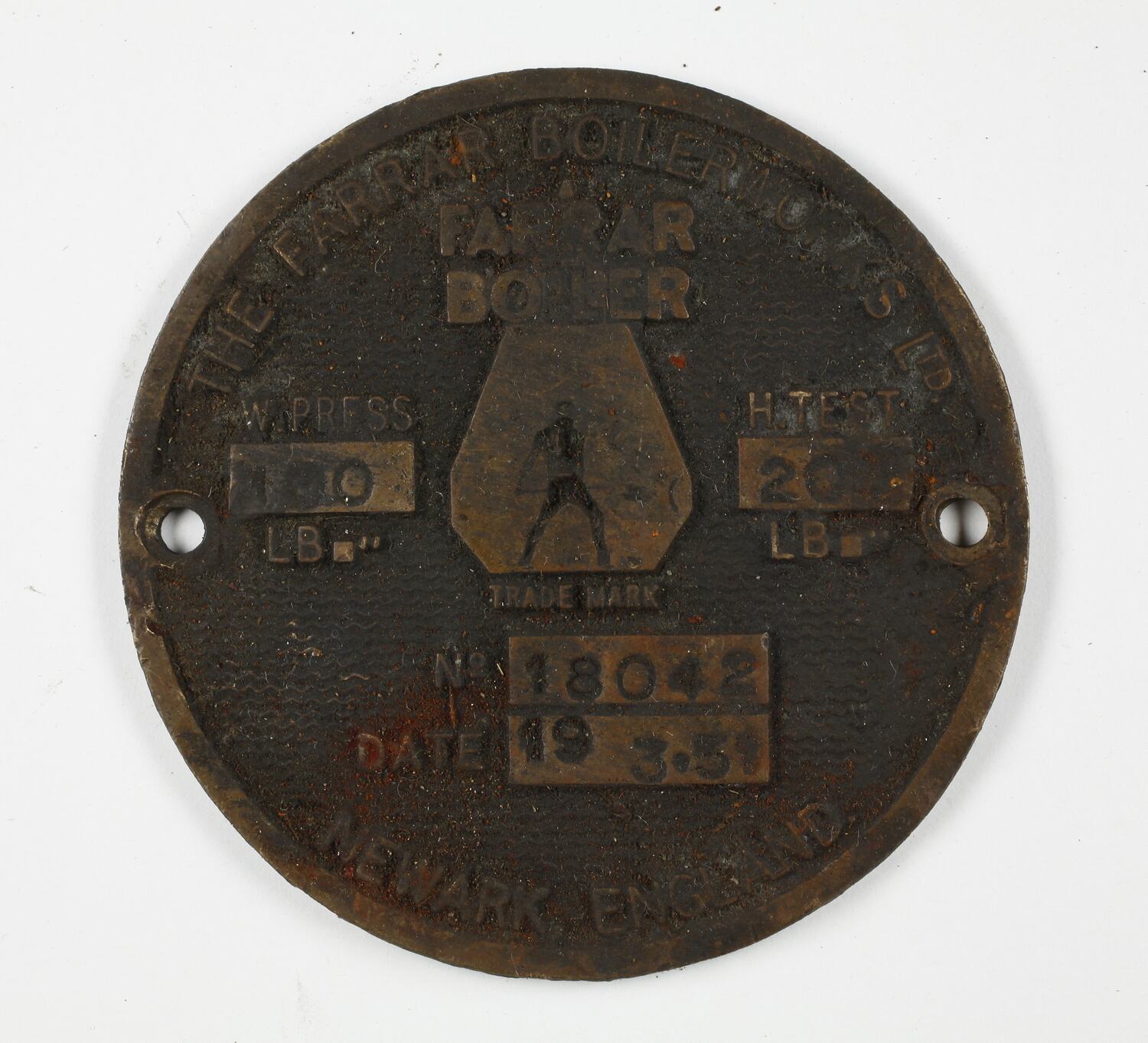 Front of plate: " THE FARRAR BOILERWORKS LTD. / FARRAR / BOILER / [image of man] / TRADEMARK. / No. 18042 / DATE 19 3 . 51 / NEWARK, ENGLAND. ", " W.PRESS / 100 / LB." ", " H.TEST / 200 / LB." "