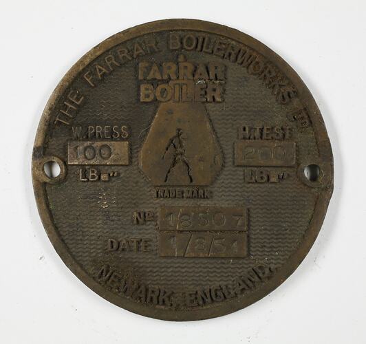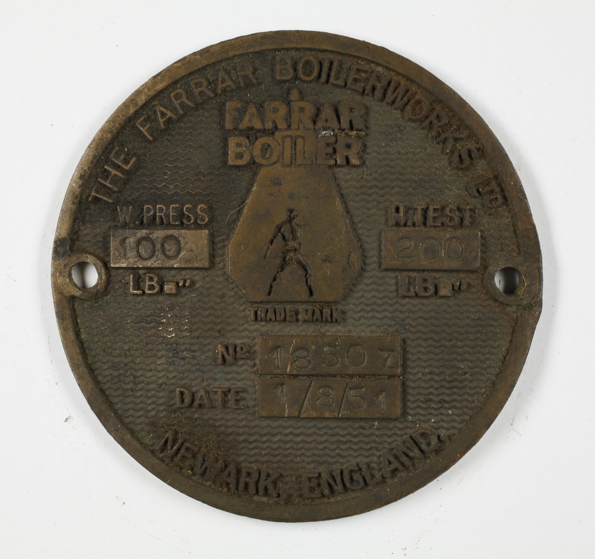 Front of plate: " THE FARRAR BOILERWORKS LTD. / FARRAR / BOILER / [image of man] / TRADEMARK. / No. 18507 / DATE 1/8/51 / NEWARK, ENGLAND. ", " W.PRESS / 100 / LB." ", " H.TEST / 200 / LB." "