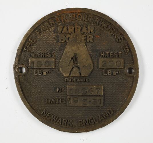 Front of plate: " THE FARRAR BOILERWORKS LTD. / FARRAR / BOILER / [image of man] / TRADEMARK. / No. 18047 / DATE 19 3 . 51 / NEWARK, ENGLAND. ", " W.PRESS / 100 / LB." ", " H.TEST / 200 / LB." "