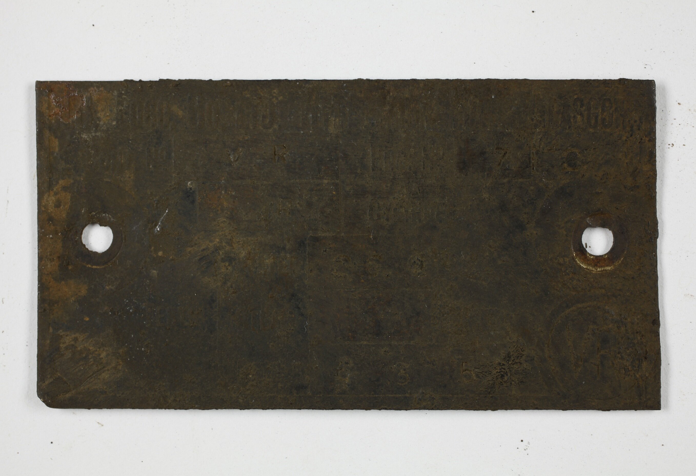 Rectangular brass plate with stamped text and text in shallow relief. Two holes at outer edge.