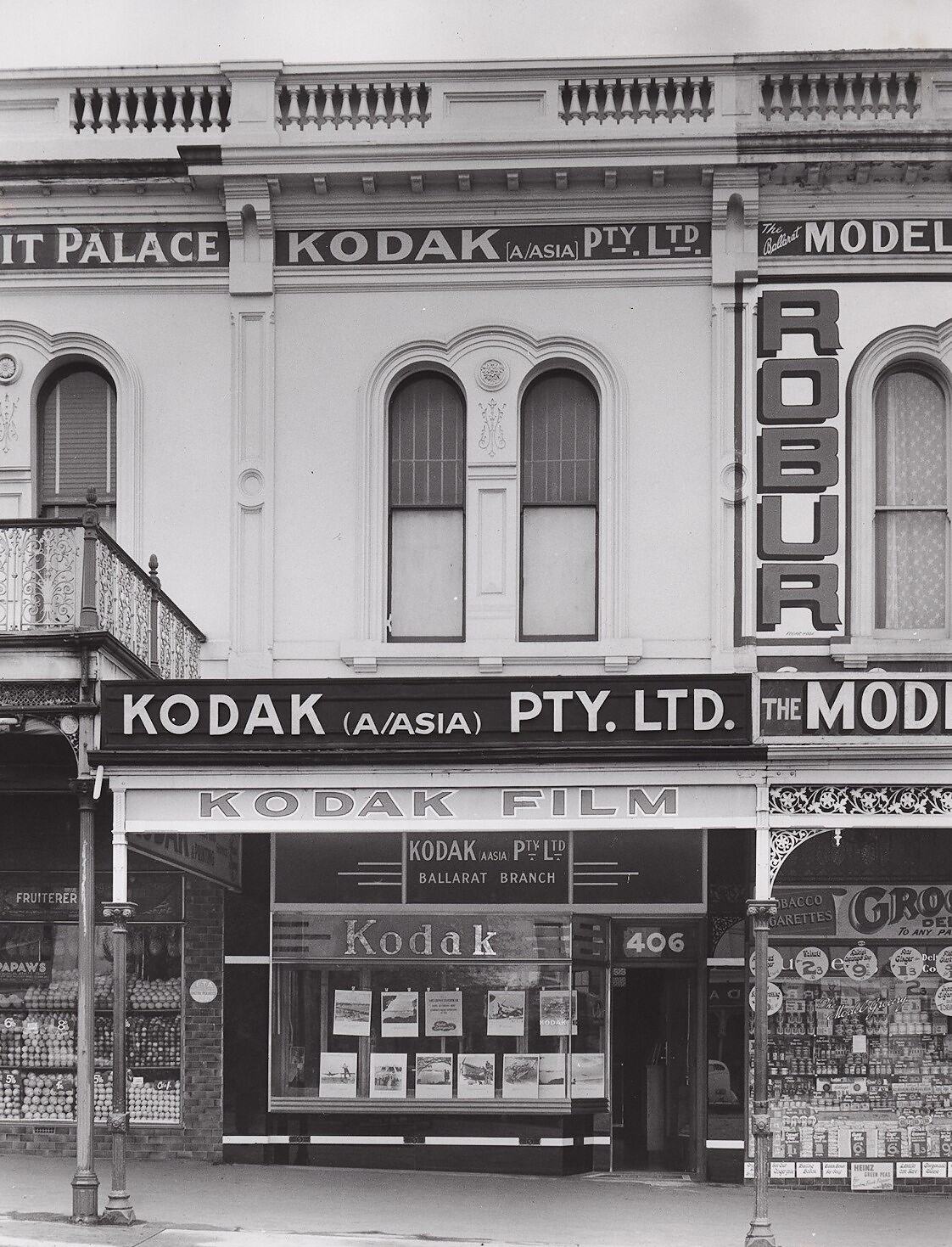 Black and white photograph of the Kodak Australasia Pty Ltd shopfront on Sturt Street, Ballarat, circa 1930s-40s. There are photographic posters hung in the window.