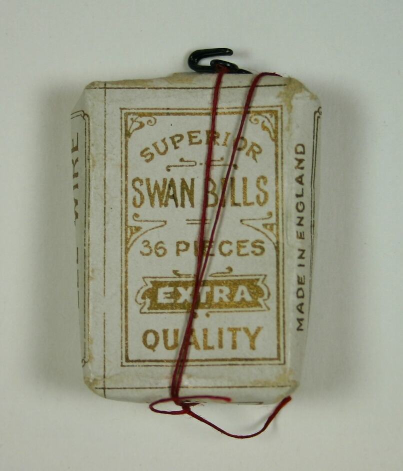 Small packet of Sarbon brand Swan Bills No. 4 size hooks and eyes, containing 36 pieces, made in England, circa 1920. These were made from 'superior extra quality' steel wire. They were thought to have been purchased for use by the donor's mother.