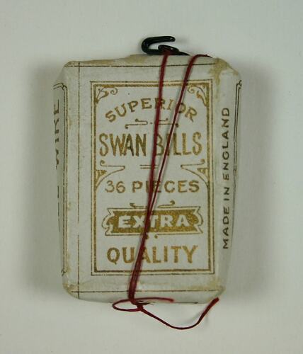 Small box of 36 hooks and eyes used for dressmaking. White box with brown graphic and text on all sides. Two threads of red cotton tied around box with a single 'Swan Bill' tied to the cotton at the top. Donated along with another identical box.