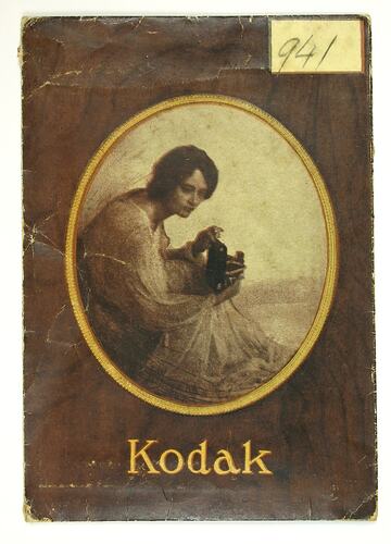 Printed, front, gold ink: 'Kodak' (underneath an image of a woman holding a folding camera, framed within an oval gold border) Handwritten, pencil, in plain box, top right corner: '941' Printed, inside left, black ink: 'Be Sure Your Film is KODAK N - C FILM / ... / If it isn't Eastman, it isn't Kodak Film.' [There is further extended text not transcribed] Printed, inside right, black ink: 'Let us make / ENLARGEMENTS / of your / Favourite Negatives' [There is further extended text not transcribed] Printed, back, gold ink:'K' (Kodak logo or trademark enclosed in gold circle with outer rim text:) 'IF IT ISN'T AN EASTMAN / K / IT ISN'T A KODAK' Printed, back, black ink: 'Kodak ( Australasia) Ltd. / 284 Collins Street, Melbourne, / 379 George Street, Sydney, / 37 Rundle St., Adelaide, 250-252 Queen St., Brisbane / AND AT / Townsville, Toowoomba, Broken Hill, Hobart, / Wellington (N.Z.), Auckland (N.Z.) and Dunedin (N.Z.)'