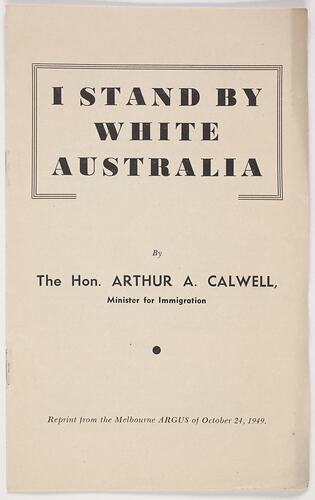 Black and white printed pamphlet 'I Stand By White Australia' written by by Arthur A. Calwell, Minister for Immigration. This pamphlet reprint of the article first published by the Melbourne Argus on October 24, 1949. It is Calwell's response to the article 'Case for a Quota of Asian Migrants' by Professor W. Macmahon Ball, Professor of Political Science, University of Melbourne published in the Melbourne Argus on 17 October, 1949. Calwell had this article reprinted in pamphlet form for circulation among people who did not read the newspaper in which it originally appeared.