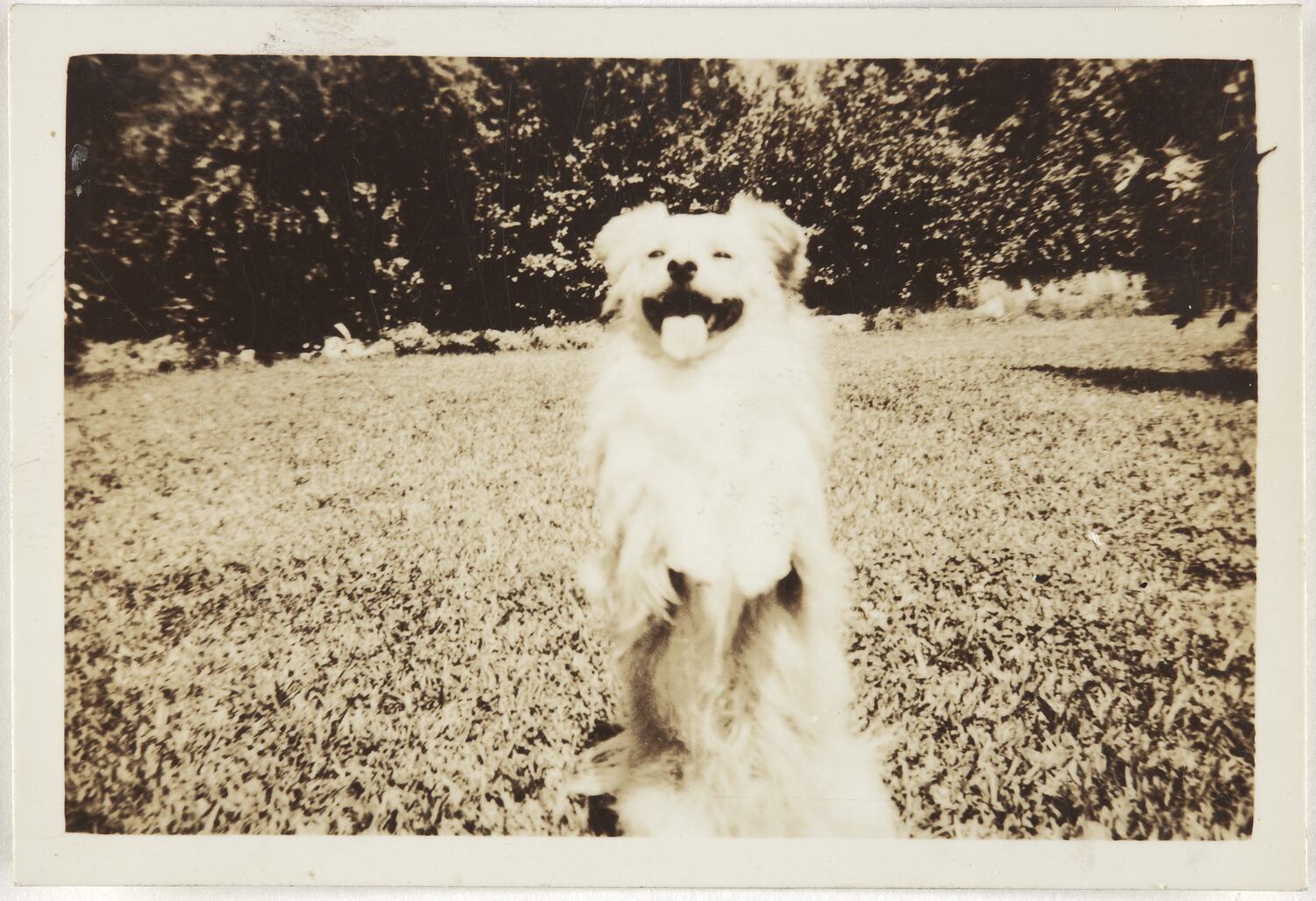 Digital image file. A digital photograph was taken of the original black and white print. Image of a dog sitting in a garden with white border.